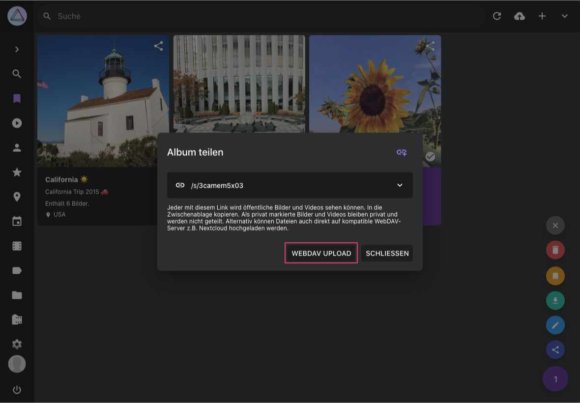 In den Einstellungen kannst du deine PhotoPrism-Instanz mit anderen Diensten mit WebDAV-Unterstützung verbinden, zum Beispiel mit anderen PhotoPrism-Instanzen, Nextcloud oder ownCloud.